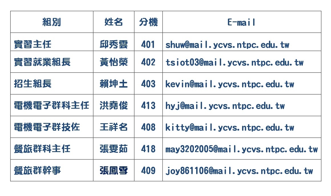 實習處行政人員分機及電子信箱